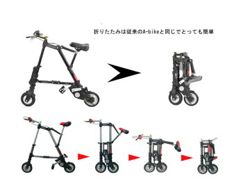 詳しくはこちら! ■日本語クイックスタートガイド付 A-bike Plus A-bike City A-bike electric■電動アシストA-bike 世界初、折りたたみ超軽量、超小型、両輪駆動アシスト自転車 ■折り畳んで、電車、バスに持ち込める機能はそのまま!! ■新規格アシスト採用でアシスト比率アップ!! ■前輪電動アシスト・後輪チェーン駆動で坂道グイグイ!!避難対策にも! ■一度のフル充電で約14キロ走行可能!! ■電池はSONYのリチウムイオン電池を採用!! ■充電はいつでもどこでもスマホ感覚!! ■世界同一価格で安心・お得!! ■タイヤはノーパンク式とチューブ式のお好きなものを!! ■PSE取得済み!! ■6か月保証付き!! ■無制限PL保険加入で安心!! 読売テレビ あさパラ!「モモタン」のコーナー 2018年3月24日で紹介されました! A-bikeを開発したシンクレア卿とは! A-Bikeはイギリスの著明な発明家シンクレア卿によって開発された世界最小・最軽量級の折りたたみ式自転車です。